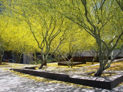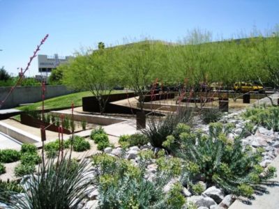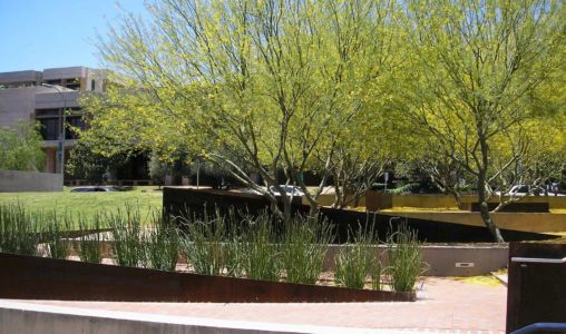 We created a visual statement with sculptural desert plant materials, rustic local rock, massings of indigenous trees and naturally cooled spaces for people. The landscape design responds to the needs of the university campus mall, and integrates the concepts of light, reflection and perspective. Relief air from the high-performance HVAC system is utilized to temper the exterior plaza space. This cooled air, which is typically exhausted where convenient, is conveyed via an underground duct to the outside amphitheater. The sunken plaza creates a micro-climate which helps contain the cooler air. The plaza’s design maximizes the use of permeable surfaces. Rip rap was used around the planted terraces and decomposed granite at the tree grove and around pathways. This promotes the absorption of surface water and minimizes the impact of runoff water from the site. Low water use and regional plants and trees, such as the Desert Museum palo verde were used. The project included: